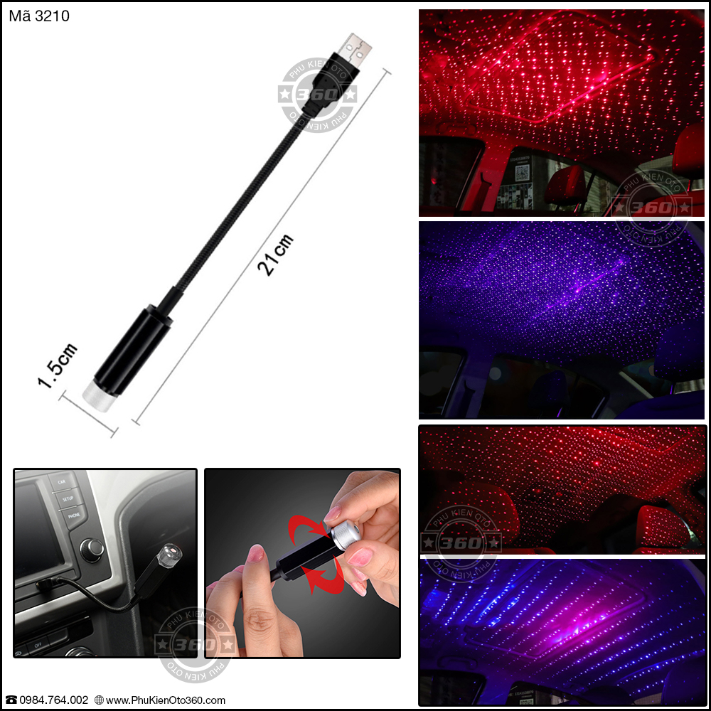 Mã 3210 Đèn USB chiếu chùm LaserGiá trên của 1 đèn (Chọn màu: ĐỎ, TÍM)Trên xe cực sang mới có đèn trang trí trần giống như đang nhìn lên bầu trời đầy sao. Với đèn dùng cổng USB này sẽ giúp các bác sẽ có cảm giác gần giống vậy.Dùng cổng USB 5V thông dụng. Có thể từ ô tô, từ điện thoại, từ máy tính, chỉ cần là cổng USB là phát được.Đèn chiếu chùm tia Laser rất mạnh, sáng rõ nét.Có núm chỉnh ngay đầu đèn, có thể thay đổi nhiều hình dạng của tia sáng phát ra.Dây dẫn cứng có thể tùy chỉnh hướng chiếu đèn. Bọc kim loại chắc chắn.Bảo hành điện tử 3 tháng lỗi NSX đổi mới, hàng có dán tem bảo hành bên em các bác yên tâm.Nhận hàng tại nhà, kiểm tra đồng ý mới thanh toán ạ.